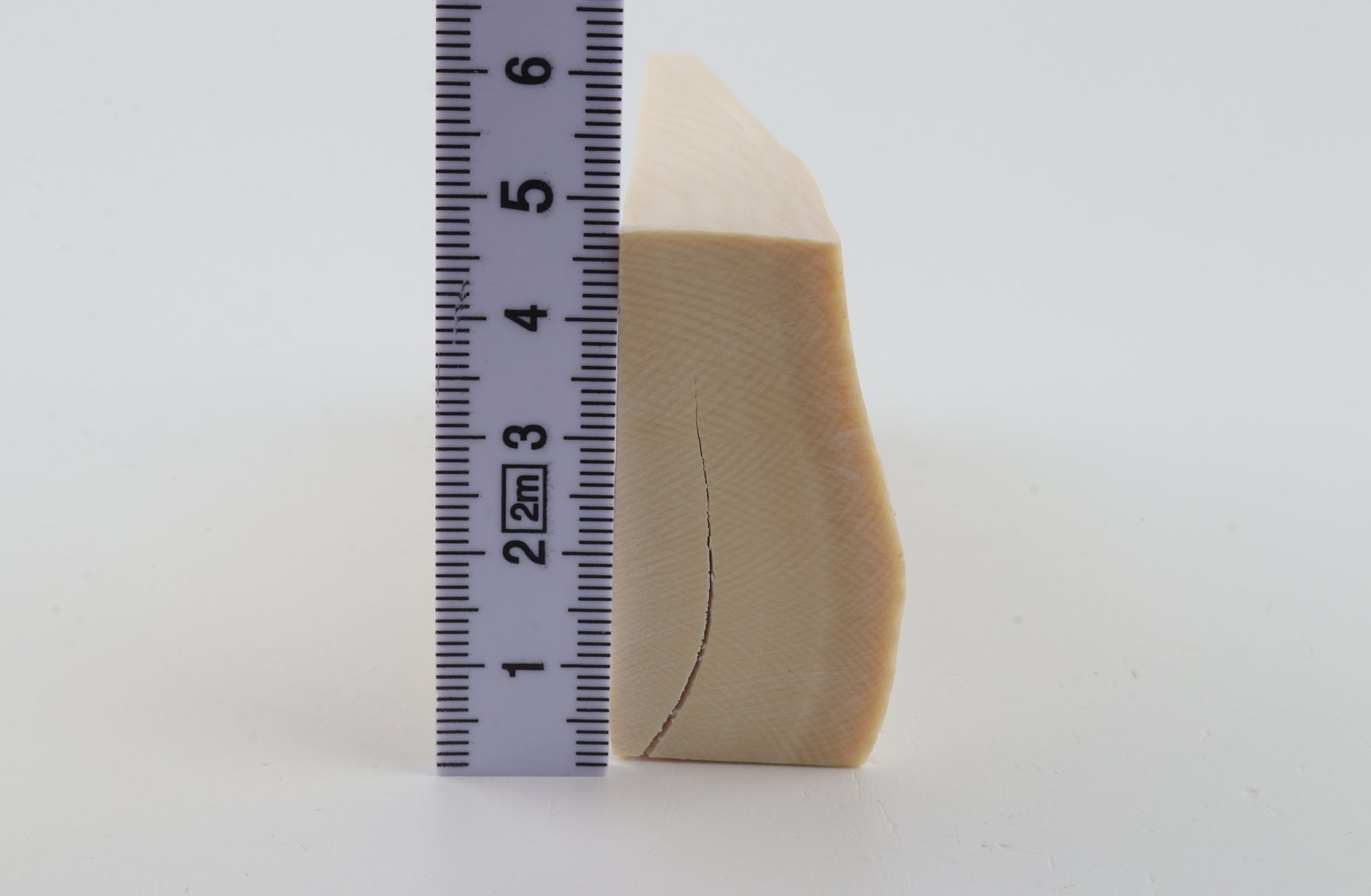This white mammoth ivory segment is completely natural and untreated. It is not stabilized or resin-filled. All of our pieces are unique in colour, structure, and shape due to fossilisation processes and long-term climatic conditions of the Siberian permafrost. No artificial treatments or restorations have been performed unless specifically stated.