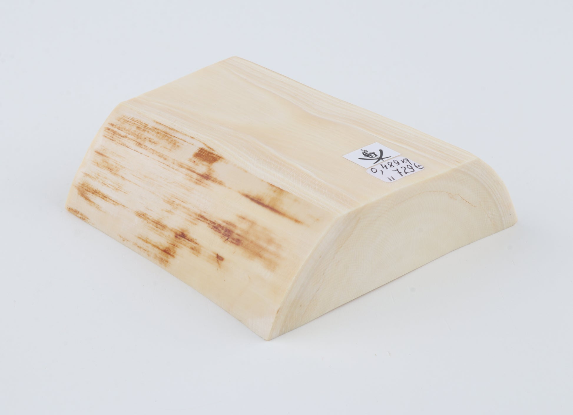 This is a premium-quality piece of Siberian woolly mammoth ivory (Mammuthus primigenius). The ivory is naturally dense and solid, despite one small crack. Consistent width and thickness with reserves on both ends. The piece displays its original, natural ivory tone. The colour of the outer layer of bark is brown-orange.